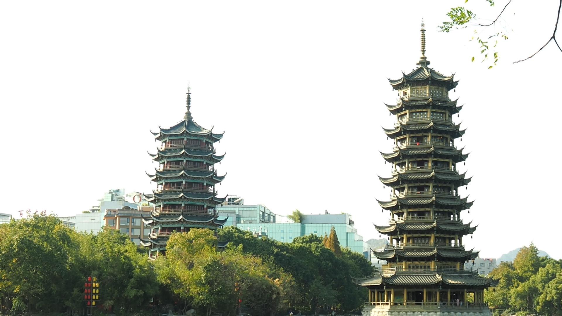 ไม่ว่าจะมาตอนกลางวัน หรือตอนกลางคืนก็สวยทุกเวลากับ เจดีย์เงิน เจดีย์ทอง ตั้งเด่นอยู่กลางทะเลสาบซานหู เป็นเจดีย์คู่ สูงประมาณ 40 เมตร โดยเจดีย์ทองสร้างจากทองเหลือง แถมยังเป็นเจดีย์ทองเหลืองที่ใหญ่ที่สุดในโลกด้วย ส่วนเจดีย์เงินสร้างด้วยปูนสีเงิน ตั้งอยู่คู่กันสวยงามมีเอกลักษณ์มากๆ สามารถมาเดินชมบรรยากาศกันได้เพลินๆ เพราะพื้นที่โดยรอบเจดีย์เป็นสวนสาธารณะ มีลมเย็นๆ จากทะเลสาบพัดมาให้ชื่นใจ เรียกได้ว่าเป็นอีกหนึ่งจุดชมวิวที่สวยงามอีกแห่งในเมืองกุ้ยหลิน