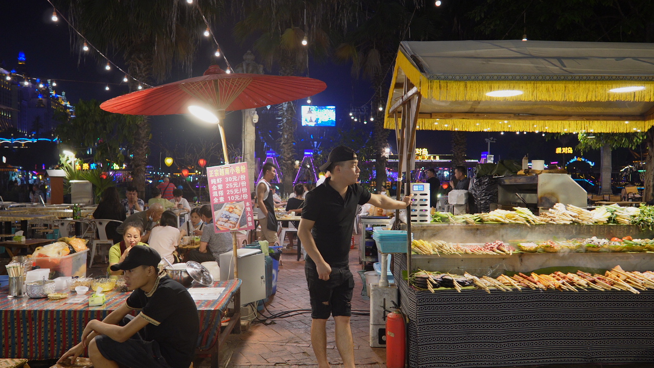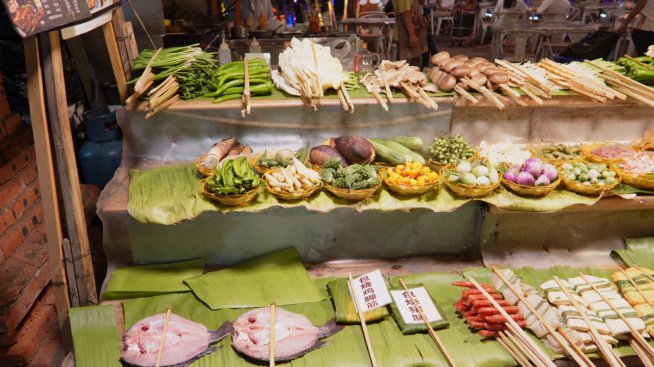 ร้านขาย “ซาวข่าว” ในตลาดกลางคืนสิบสองปันนา มีทั้ง ปลานิล หมูสามชั้น ไส้หมู ตับหมู ตับไก่ ไก่ป่า ไส้กรอก รากบัว เต้าหู้ เสียบเป็นไม้ ให้เลือกรับประทาน