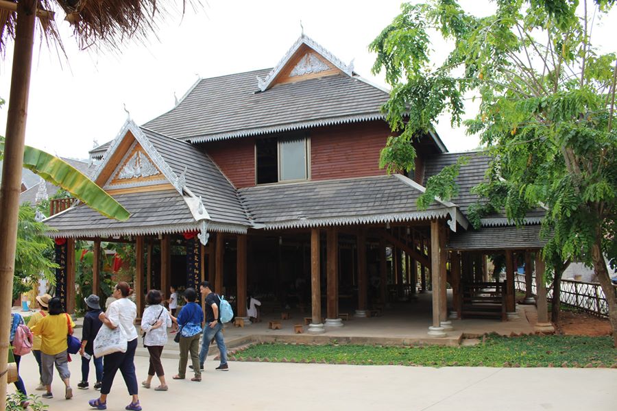 ขณะเมื่อเดินเข้าหมู่บ้าน มีสาวชาวไตลื้อยืนสองแถวถนนยาวเหยียดคอยต้อนรับ ดูเหมือนเธอจะพูดว่า “เฮายินดีต้อนรับสู่หมู่บ้านชาวไต” มองดูลักษณะบ้านเรือนของชาวไต เห็นเสาเรือนตั้งอยู่บนอิฐ ชมสภาพชีวิตสมัยโบราณ เช่น หีบอ้อย ครกกระเดื่องตำข้าว การปั่นฝ้าย กรอด้าย ฟืมด้าย การละเล่นดนตรีพื้นบ้าน แล้วเท้าก็ไปหยุดอยู่ที่วัดหลวงของชาวไตลื้อแห่งหนึ่ง เพราะมีศิลปะโดดเด่นสวยงาม ชื่อวัดสุทธาวาส หรือวัดสวนม่อน มีชื่ออย่างทางการว่า “วัดมหาราชฐานสุทธาวาส” มีอักษรไทยและอังกฤษเขียนประวัติการบูรณะปฏิสังขรณ์ไว้ชัดเจน
