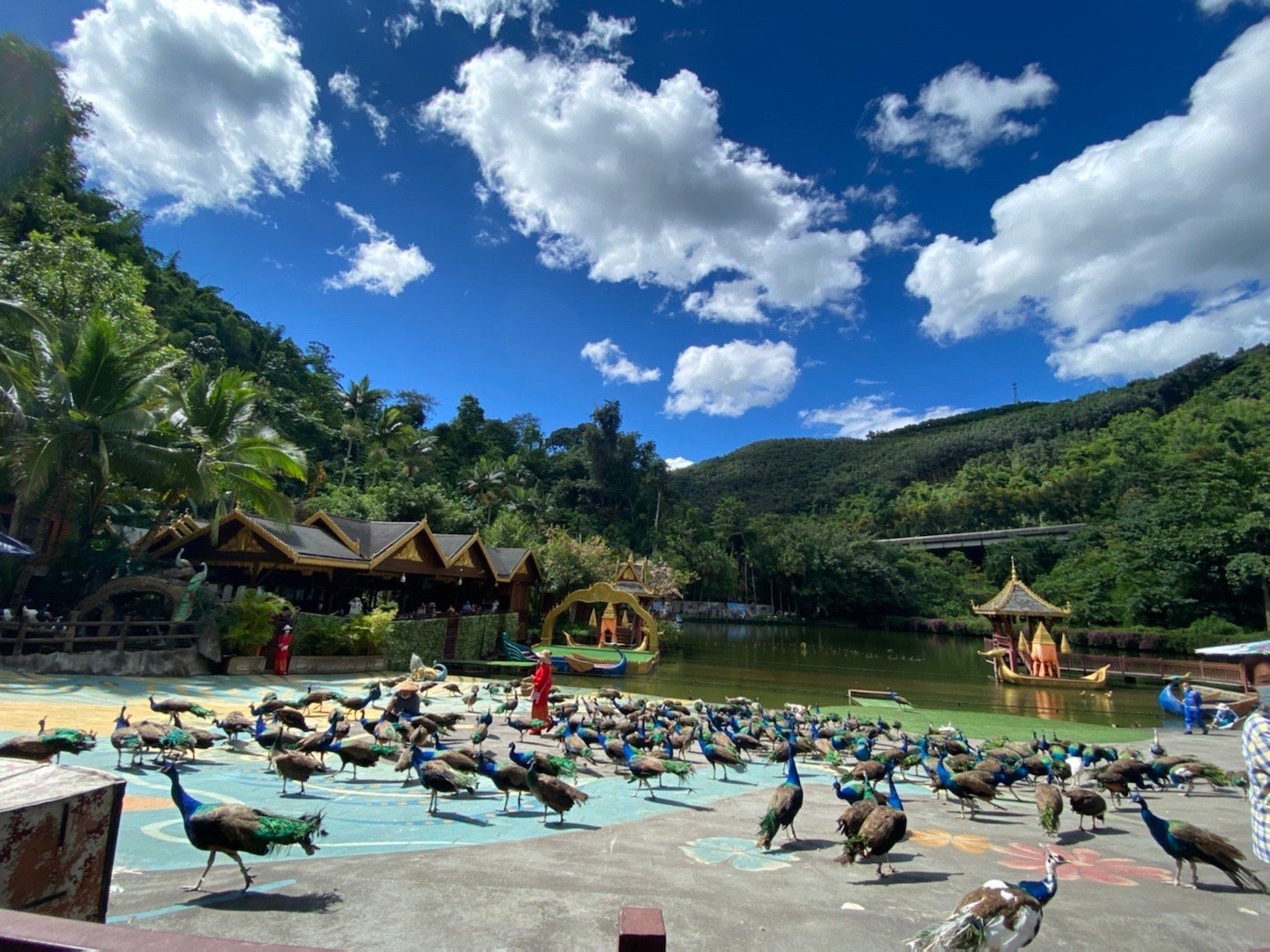 สวนป่าดงดิบสิบสองปันนา อยู่ทางด้านทิศตะวันออกของเมืองเชียงรุ้ง ห่างจากตัวเมืองเชียงรุ้ง ๘ กิโลเมตร เป็นป่าดงดิบเขตร้อนที่อยู่ใกล้เชียงรุ้งที่สุด ครอบคลุมพื้นที่ราว 1.5 หมื่นไร่ ภายในสวนป่าดงดิบมีสภาพป่าเขตร้อนที่อุดมสมบูรณ์ ซึ่งมีพันธ์ไม้เขตร้อนและสัตว์ป่านานาชนิดอาศัยอยู่ มีหมู่บ้านชนกลุ่มน้อยจำลองและร้านอาหารเรือนรับรองแขกอยู่ภายในสวน มีการแสดงของชนพื้นเมืองและพิธีแต่งงานของชนกลุ่มน้อยให้นักท่องเที่ยวได้ชม มีการแสดงการเลี้ยงนกยูงที่สวยงามน่าประทับใจ มีส่วนที่เป็นกรงสัตว์ซึ่งจะมีการแสดงของสัตว์แสนรู้ เช่น เสือ หมี ลิง เป็นต้น