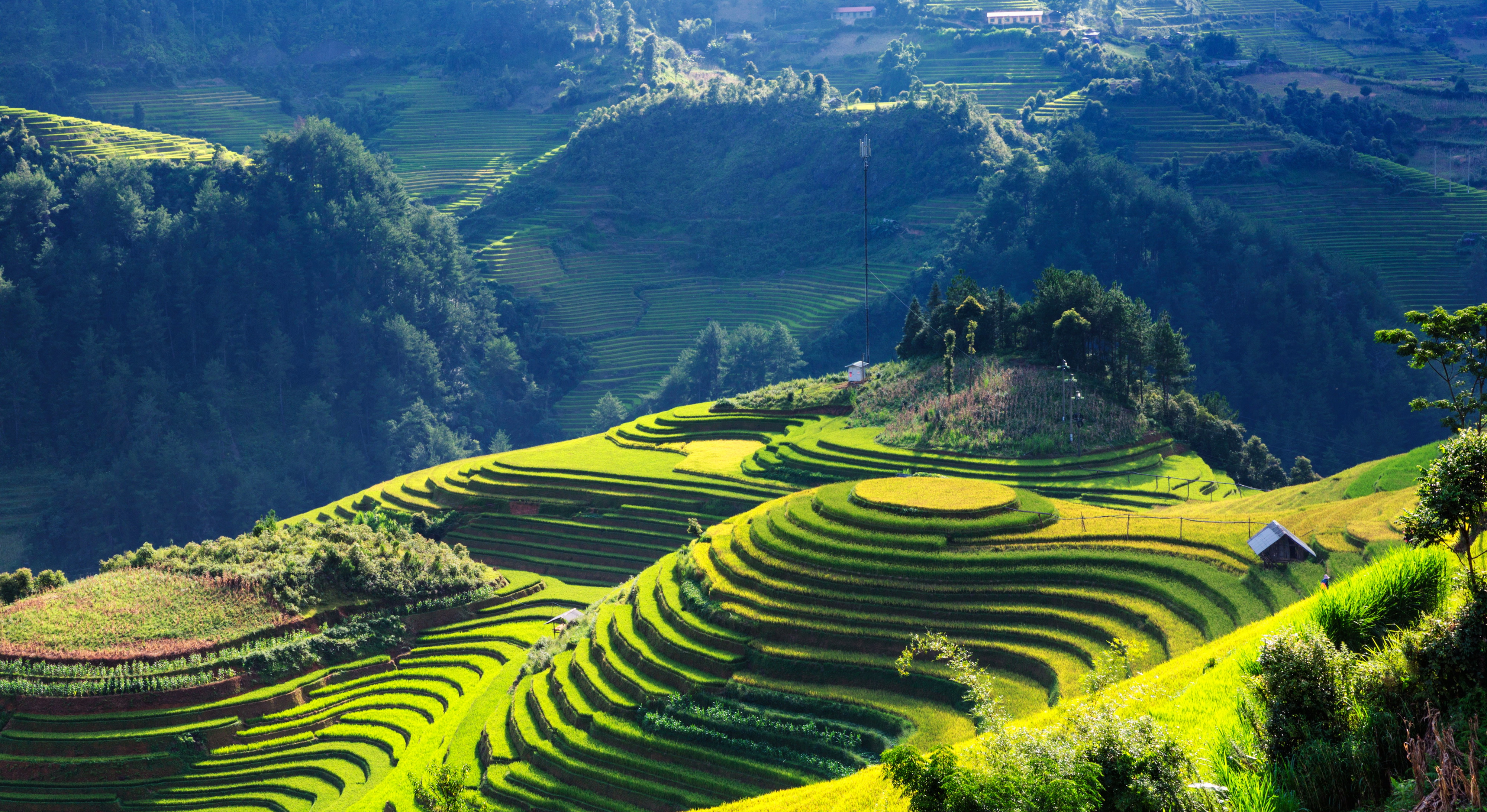 อีกพิกัดที่ไม่ควรพลาดในการชมนาขั้นบันได ก็คือที่ หุบเขาเมืองหัว หรือ เหมื่องฮวา ในช่วงเดือนมิถุนายน-สิงหาคม นาขั้นบันไดจะเป็นสีเขียวขจีเต็มพื้นที่ ส่วนตั้งแต่เดือนกันยายน-พฤศจิกายน ถือเป็นช่วงเวลาที่ดีที่สุดของปีที่จะมีโอกาสได้เห็นทะเลสีทองของผืนนาขั้นบันไดที่ใกล้เวลาเก็บเกี่ยว นอกจากนี้ ที่หุบเขาแห่งนี้ยังมีหมู่ก้อนหินขนาดใหญ่หลายร้อยก้อนที่ถูกแกะสลักด้วยภาพวาดลึกลับ ซึ่งไม่มีใครสามารถอธิบายถึงที่มาที่ไปได้ โดยภาพวาดเหล่านี้มีชีวิตอยู่มานานหลายศตวรรษท่ามกลางต้นไม้ใหญ่ มาชมวิวทุ่งนาบนภูเขาสวยๆ กันได้ค่ะ