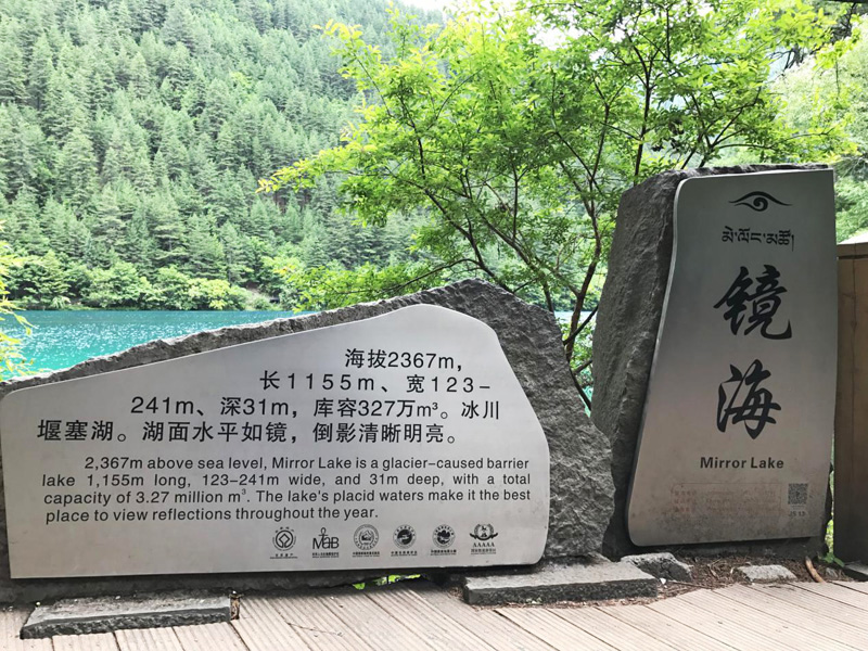 ทะเลสาบกระจกตั้งอยู่ที่ความสูง 2,367 เมตร มีความยาว 1,155 เมตร กว้าง 241 เมตร และลึก 31 เมตร เป็นทะเลสาบที่ใหญ่เป็นอันดับสามของอุทยานแห่งชาติจิ่วจ้ายโกว ได้รับการตั้งชื่อตามความเงียบสงบของผิวน้ำที่สะท้อนทุกสิ่งราวกับกระจก ในยามรุ่งอรุณที่แสงแรกสาดส่อง ท้องฟ้าสีคราม เมฆขาว ภูเขาที่อยู่ไกลออกไป และแม้กระทั่งนกที่โบยบิน ล้วนสะท้อนอยู่ในผิวน้ำอย่างชัดเจนและสวยงาม จนภาพสะท้อนนั้นดูงดงามยิ่งกว่าของจริง