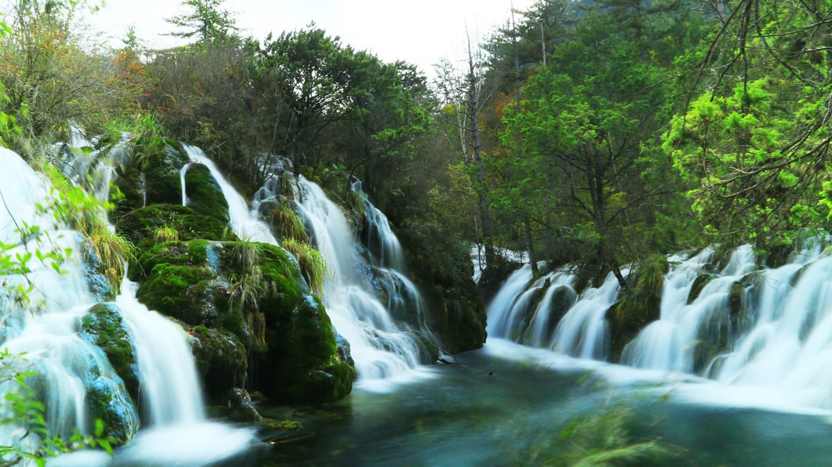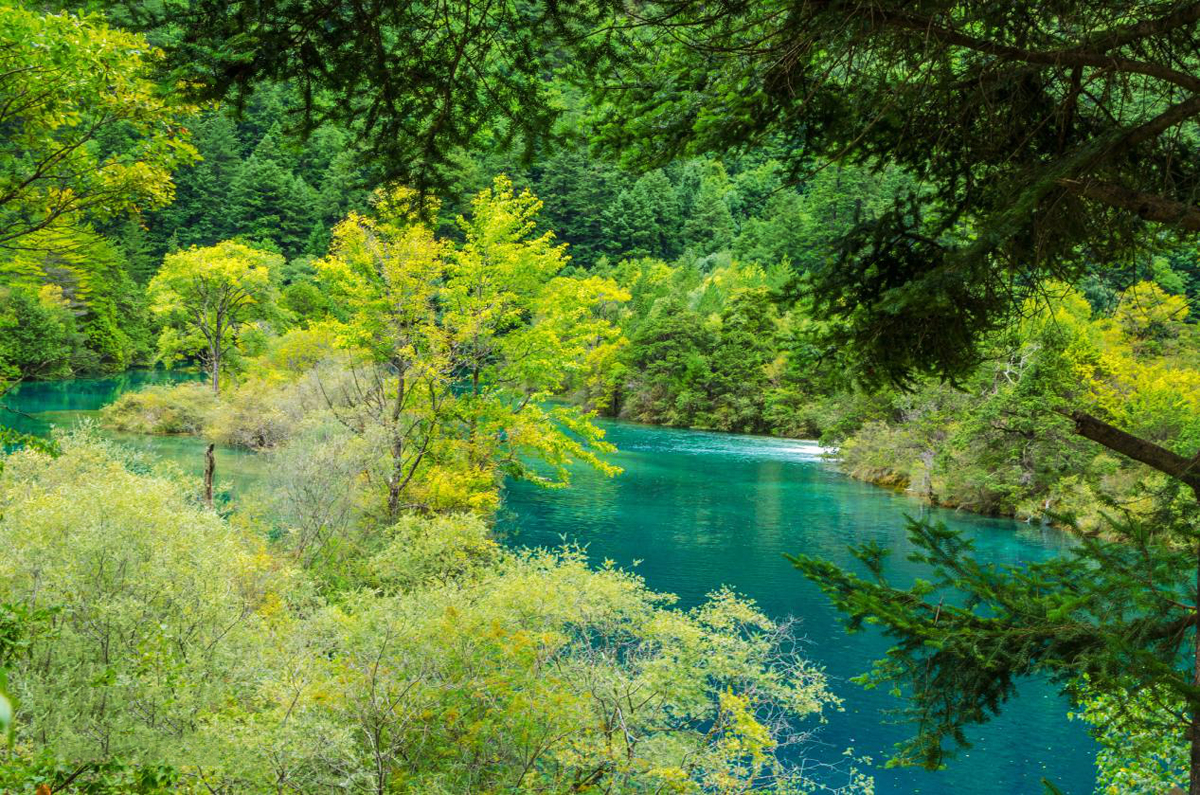 ทะเลสาบคู่มังกรโอบล้อมไปด้วยต้นไม้สูงใหญ่มากมาย และมีเศษซากกิ่งไม้ที่ล้มจมอยู่ใต้น้ำเป็นจำนวนมาก บนผิวน้ำสีน้ำเงินเข้มจะมีกิ่งไม้สีเหลืองอมน้ำตาลที่ผลิใบสีเขียวสดขึ้นมาใหม่ ดูเป็นภาพที่ละเอียดอ่อนงดงามและเต็มไปด้วยชีวิตชีวา เป็นการผสมผสานระหว่างต้นไม้ที่แห้งเหี่ยวและพืชที่งอกขึ้นใหม่ สะท้อนให้เห็นถึงพลังของธรรมชาติและร่องรอยของกาลเวลาได้อย่างน่าทึ่ง