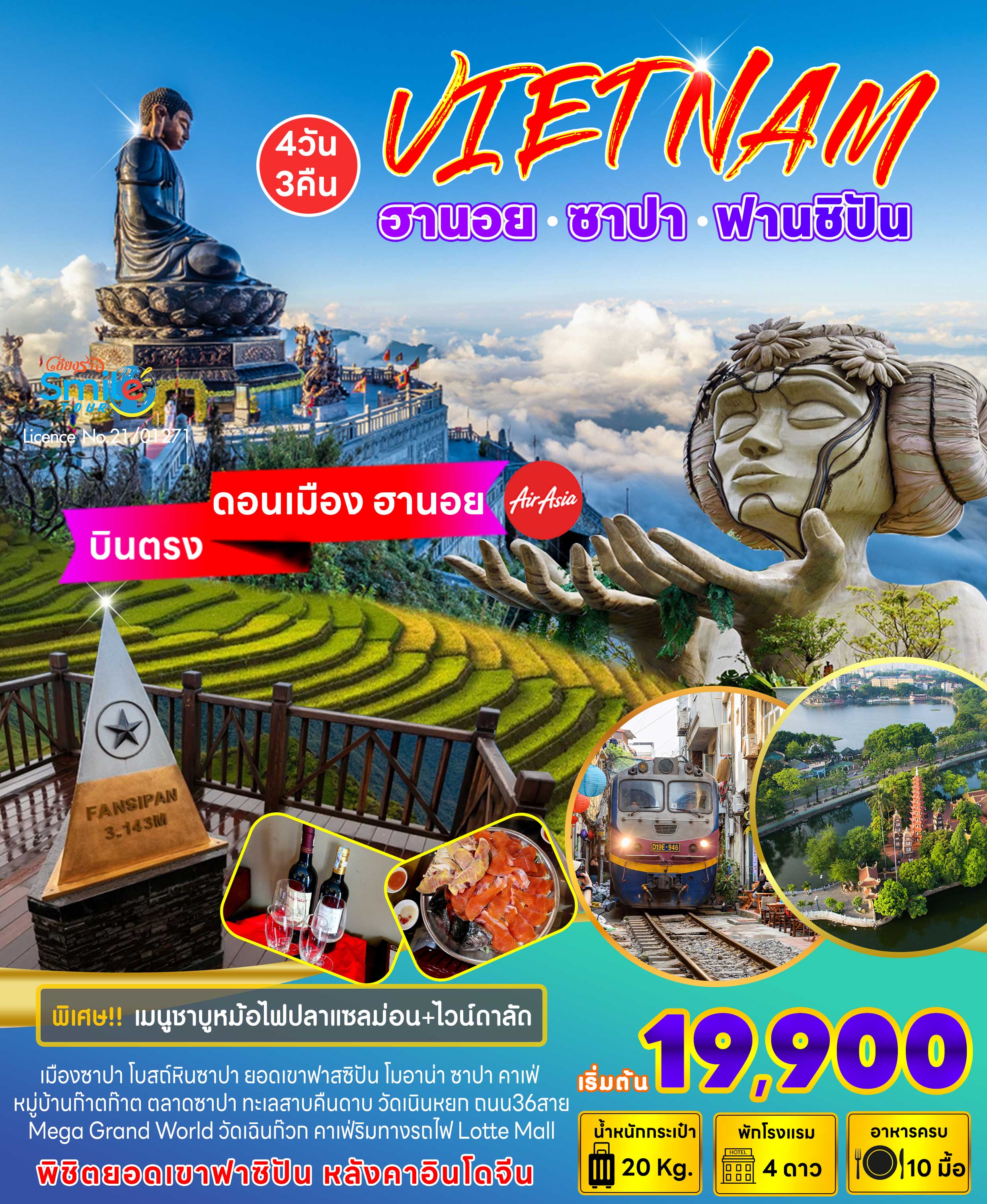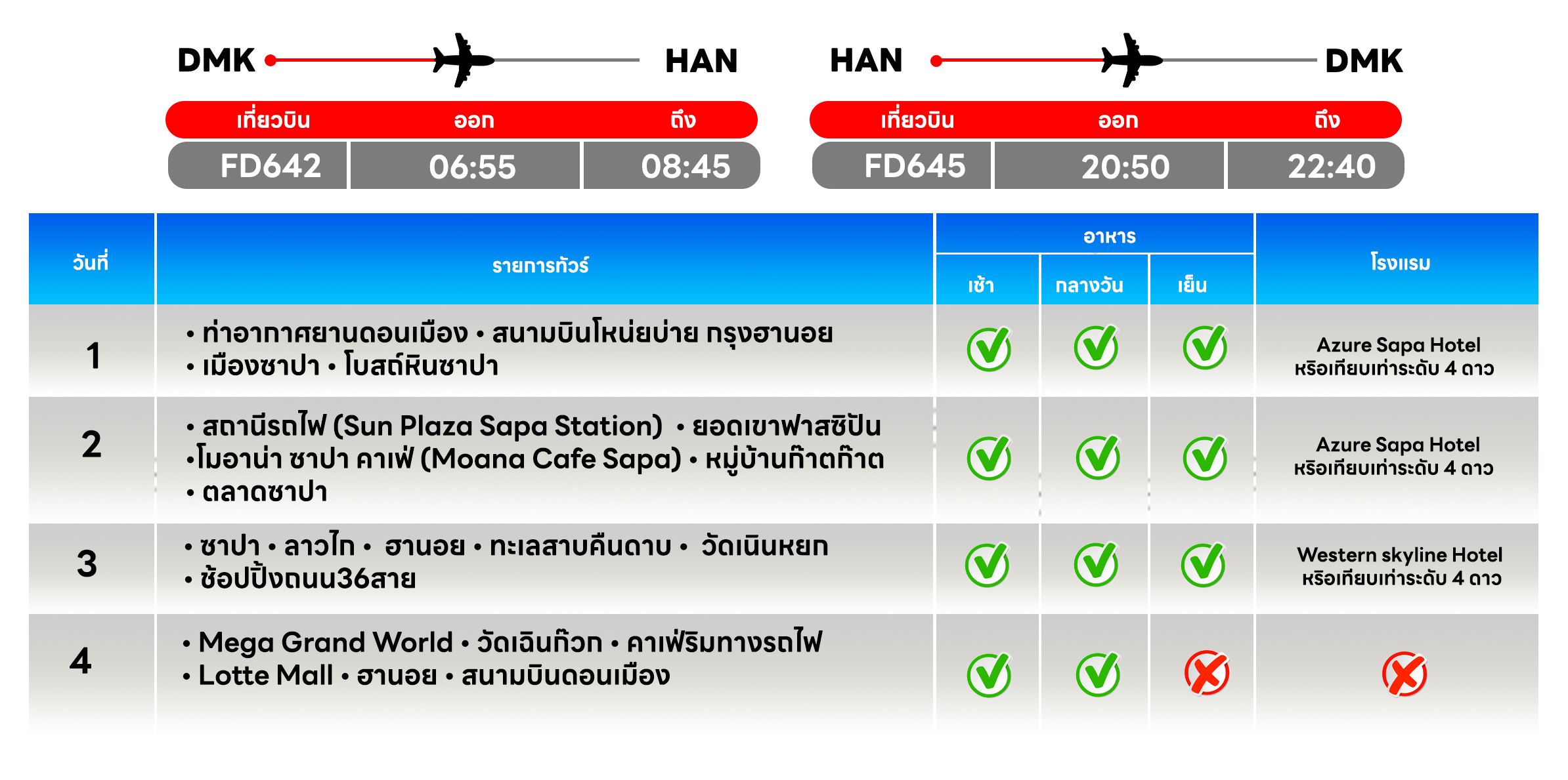 | วันแรก สนามบินดอนเมือง FD642 06.55-08.45 - สนามบินโหน่ยบ่าย ฮานอย – ซาปา โบสถ์หินซาปา |